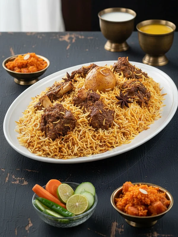 Slow-cooked marinated goat layered with fragrant basmati rice, potato, and egg.